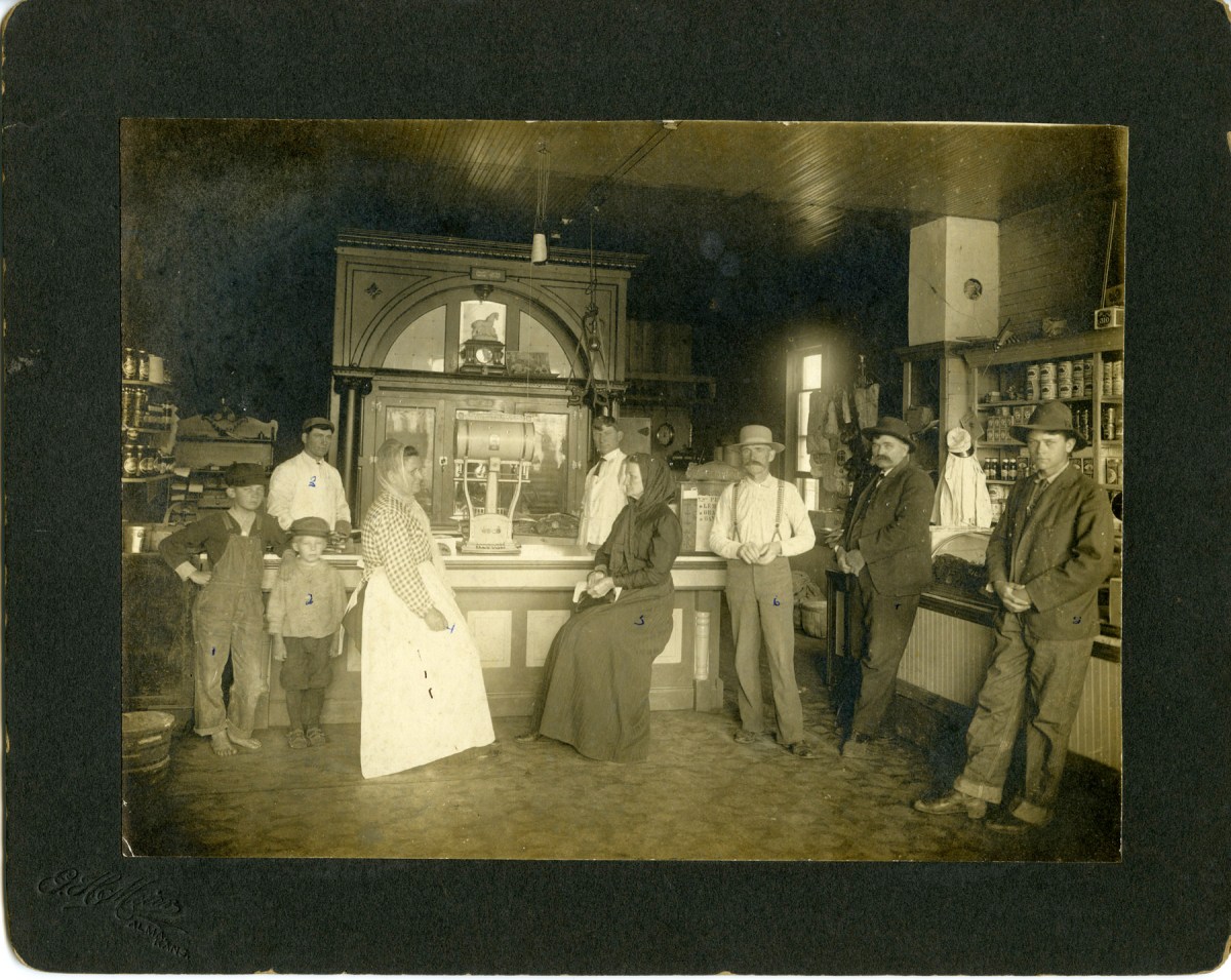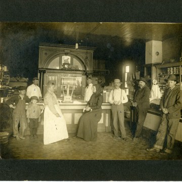 From the Bat Nelson Collection, the Ascher Meat Market in Alta Vista was located in the Masonic Building. Seen in this 1910 photograph, left to right are Bat Nelson, Victor Steinmeyer, Mrs. Jack Bunger, Mrs. Decker, Phil Christ, Purly McClane, and William Wahl. Behind the counter from left to right are, “unknown” and William Ascher.