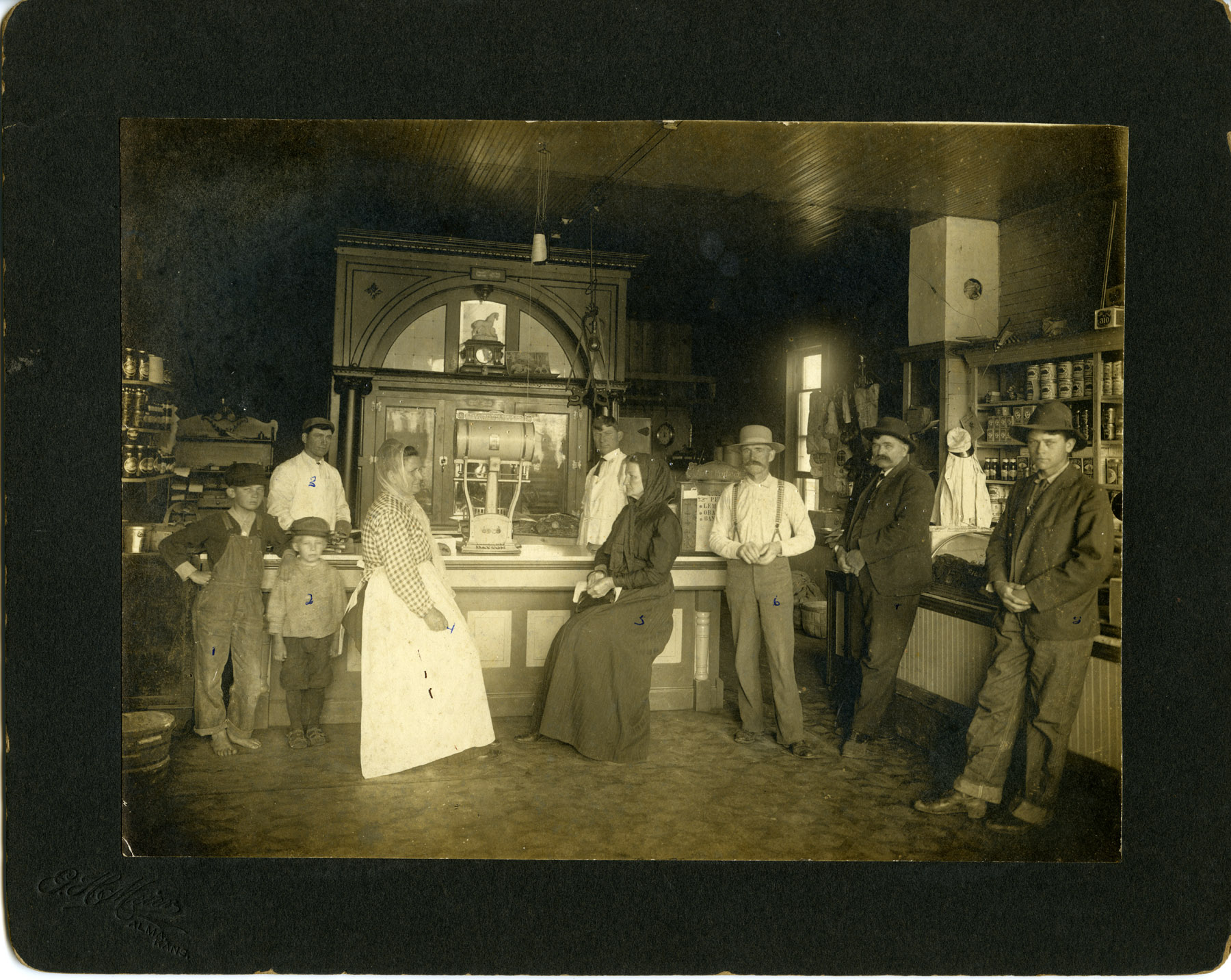 From the Bat Nelson Collection, the Ascher Meat Market in Alta Vista was located in the Masonic Building. Seen in this 1910 photograph, left to right are Bat Nelson, Victor Steinmeyer, Mrs. Jack Bunger, Mrs. Decker, Phil Christ, Purly McClane, and William Wahl. Behind the counter from left to right are, “unknown” and William Ascher.