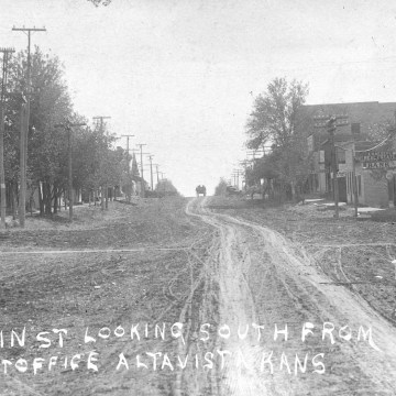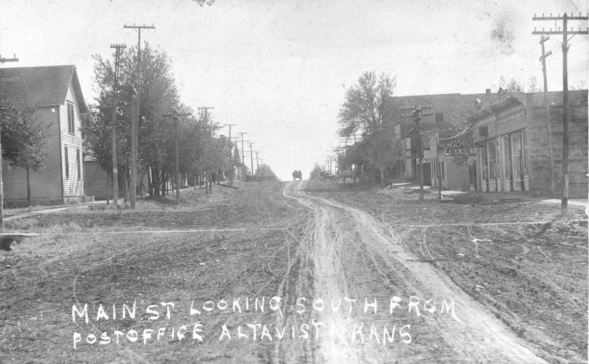 This real photo postcard shows a 1910 view of Main Street looking south from the Post Office at Alta Vista, Kansas. Photo courtesy Michael Stubbs.