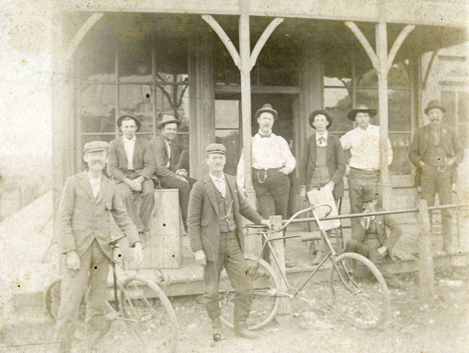 A group of men gather in front of the Bunger Hotel in Alta Vista, Kansas for this photo taken in 1908-1909. On the reverse of the photo, Alta Vista barber, Bat Nelson writes, “Man in center with arm around pole, Dr. William Smith. In 1909 the Bunger advertised in the High School annual, Board and Room $1.00 per day. Man number 3 helped dig basement for brick building that burned down, basement was dug in 1911.” No other individuals in the photo are identified.
