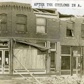 This real photo postcard view of the drug store and U.S. Post Office in Alta Vista, Kansas shows the damage inflicted by a July 18, 1912 tornado that ripped through the town. Damage was extensive throughout the town.