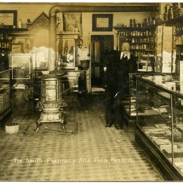 Dr. W.H.H. Smith, a doctor and registered druggist, purchased this Alta Vista drugstore from Dr. E.W. Eldridge in 1897 after practicing for several years in Eureka, Kansas. Smith established a thriving practice in Alta Vista until moving to Council Grove in 1910. This view, created as a real photo postcard, dates from 1908-1910.
