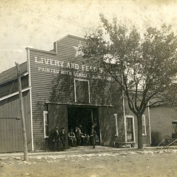 A group of men pose in the doorway of the Star Livery and Feed Store, located in Alta Vista, Kansas. On the reverse of this photo, Alta Vista barber, Bat Nelson writes, “Picture taken in 1911. Barn operated by Steven Nelson and his son, Clarence Nelson. Barn was located where Lawrence Andres home is now located. Barn was torn down in the early 19920s by George Edwards. He built the three residences, Lawrence andres, Herman Syring and Mrs. Nixon. This note written by R.S. Nelson in 1970.”