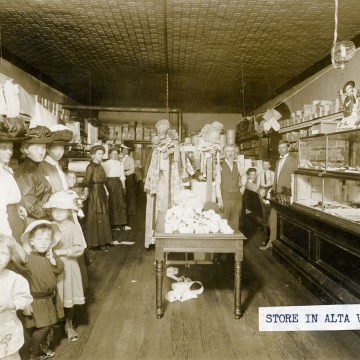 A line of ladies and children pose for the photographer inside the Star Mercantile store in Alta Vista. Typical of buildings of its era, the store is long, narrow and has no side windows. This view dates from about 1905. An advertisement for Buster Brown shoes sits on top of the stacked display counters at the far right.