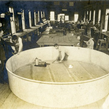 Six workers in this machine shop/metal working business are busy constructing large metal stock-watering tanks. This photo dates from about 1900 and was produced by Alta Vista photographer, W. A. McCoy.
