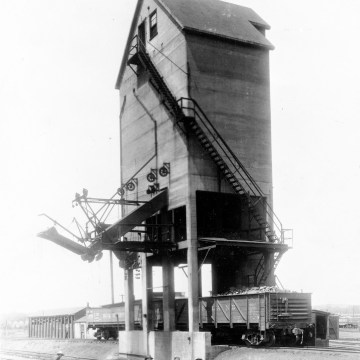 This Hilscher Photo view of the coal chute in the CRIP yards at McFarland shows a load of coal dumped into an open coal car. The coal chute was constructed in 1922. The five men seen in the photo are identified, left to right as Tony Salazar, Clint Davis, Clyde Forinash, Hy Sadler and Mac Donnley.