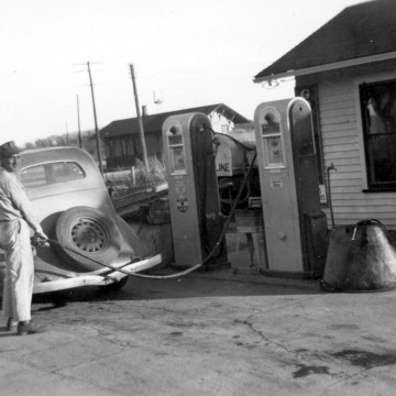 Wabaunsee County native Eddie Meinhardt pumps gas into a customer’s car at his first gas station in Paxico, Kansas in 1956. Meinhardt spent nearly a half a century as a leading businessman in Paxico, operating his stations, antique stores and a campground. One can see the Paxico depot in the background. Photo courtesy the Eddie Meinhardt family.