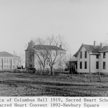 Three prominent buildings at Newbury seen here left to right are the Knights of Columbus Hall, built in 1919, the Sacred Heart School, built in 1905 and Sacred Heart Convent, built in 1892.