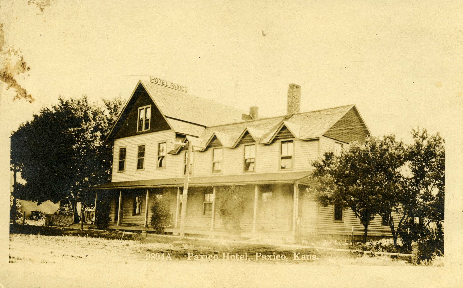 The Paxico Hotel, located at 201 Newbury in Paxico, was originally located mile north in the town of Newbury but was moved a mile south to the new town of Paxcio. This real photo postcard dates from about 1910. Photo courtesy Greg Hoots