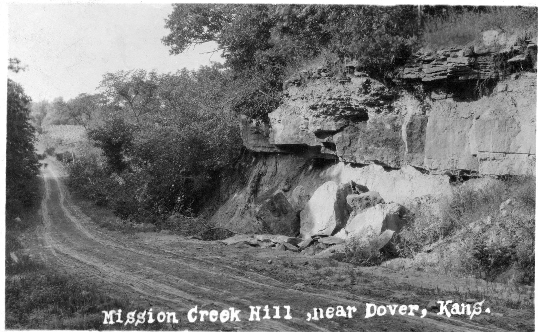This real photo postcard, circa 1910, shows K-4 Highway looking north at the Mission Creek Valley. The creek crosses K-4 about a mile north of Dover. Notice that K-4 was not paved when this photo was taken. Photo courtesy Greg Hoots.