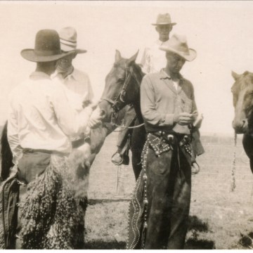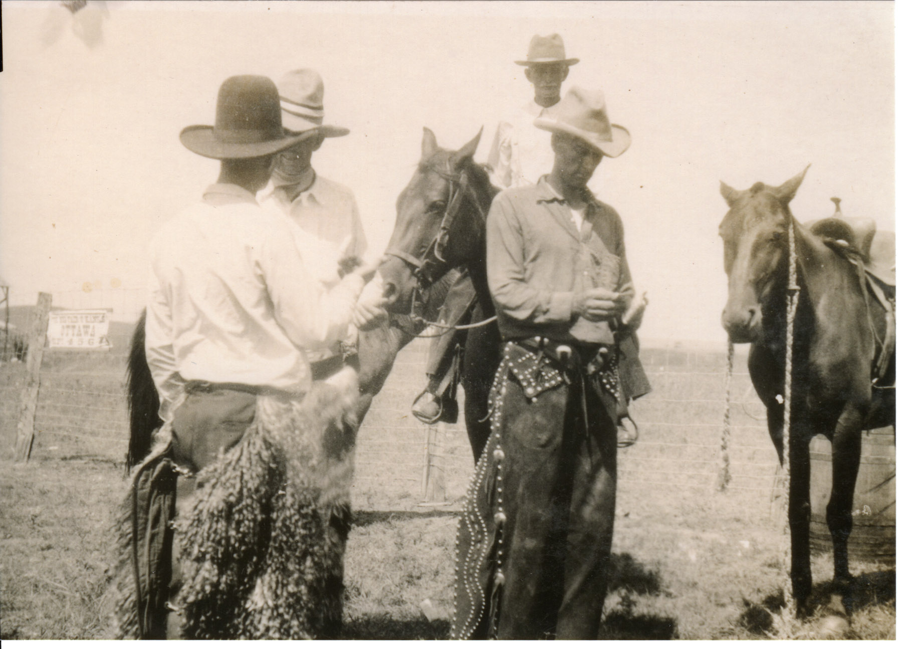 Three cowboys visit between events at the Silver Moon Ranch rodeo arena in this early 1920s view. Ranch owner, Ulysses Frank is seated on horseback in the background. Photo courtesy Trish Ringel.