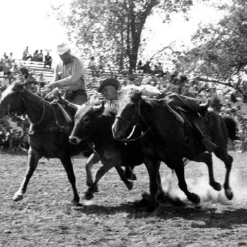 Cleo Schultz, Volland, Kansas, is seen in this 1960s view, competing in the bulldogging event at the rodeo grounds at Mayetta, Kansas. Photo courtesy Cleo Schultz.