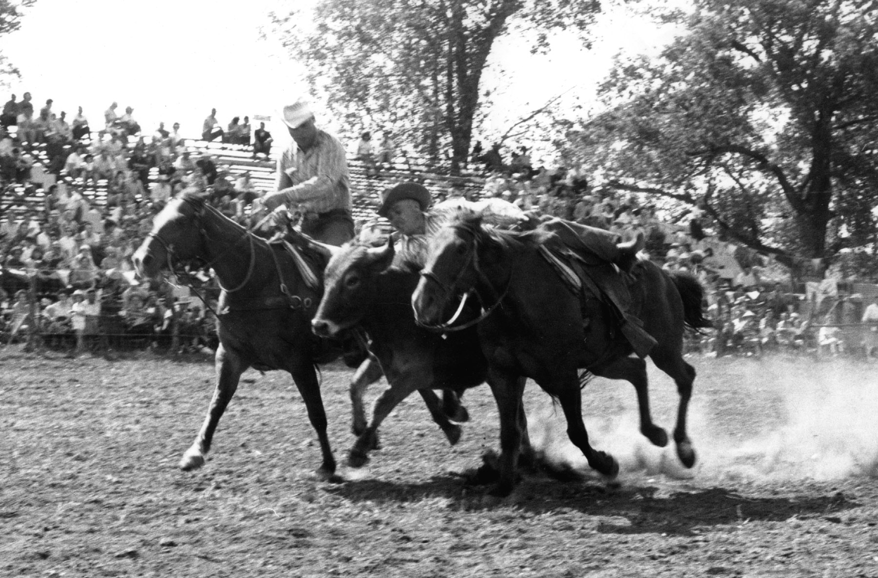 Cleo Schultz, Volland, Kansas, is seen in this 1960s view, competing in the bulldogging event at the rodeo grounds at Mayetta, Kansas. Photo courtesy Cleo Schultz.