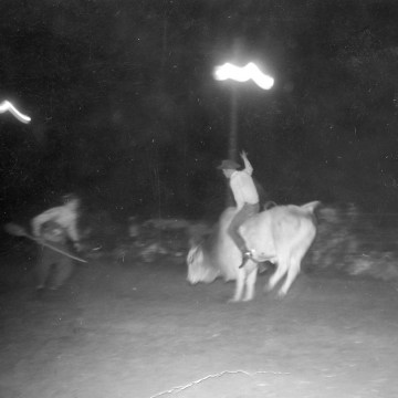 Ron Pletcher, Eskridge, Kansas, is seen in this 1959 photograph riding a bull during a night rodeo. Pletcher competed on the professional rodeo circuit in the 1950s and 1960s. Photo Courtesy Shirley Pletcher.