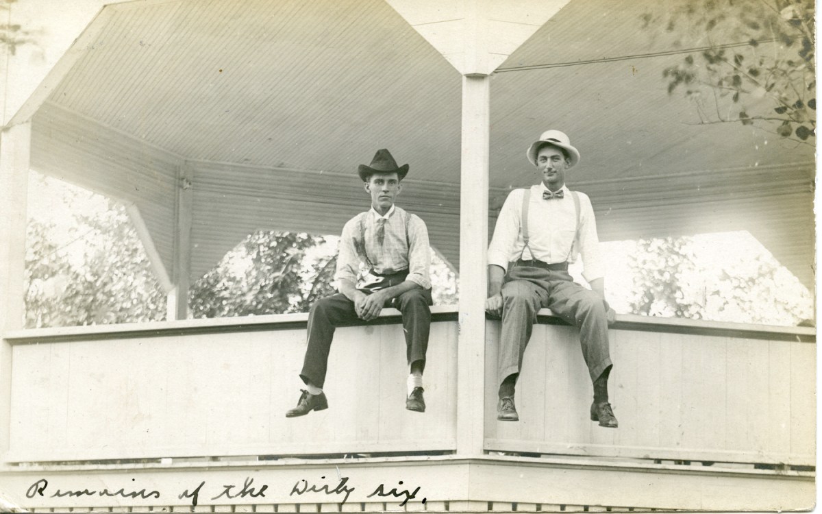 This real photo postcard, circa 1910 shows two men sitting on the railing of the bandstand, located in the City Park of Eskridge, Kansas. Handwritten at the bottom of the photo is “remains of the dirty six.”