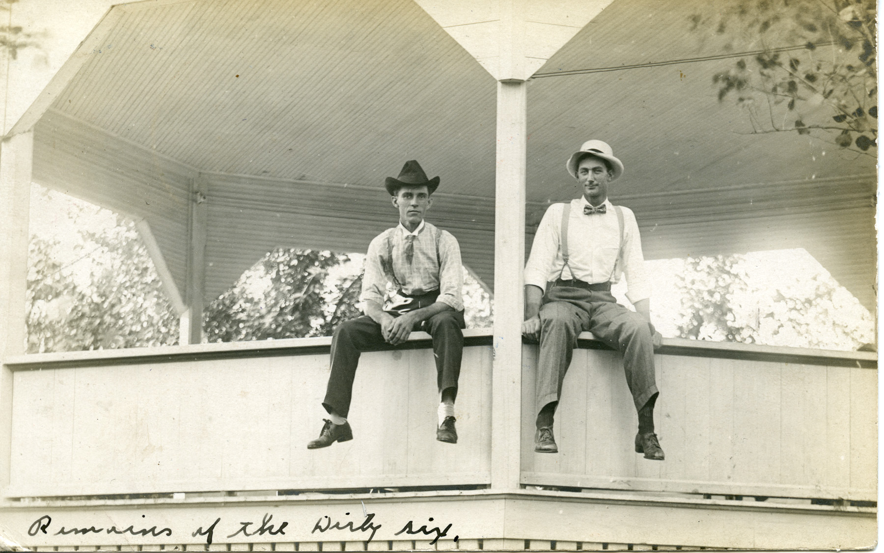 This real photo postcard, circa 1910 shows two men sitting on the railing of the bandstand, located in the City Park of Eskridge, Kansas. Handwritten at the bottom of the photo is “remains of the dirty six.”