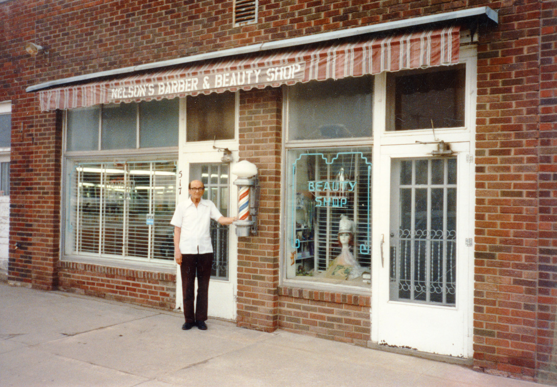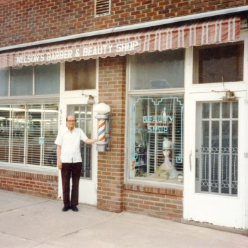 Bat Nelson stands in front of his barbershop in Alta Vista, Kansas in this view from the 1980s. Photo courtesy Michael Stubbs.