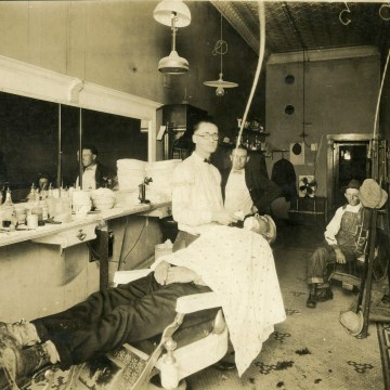 Glen Loveland, who operated this barbershop in Eskridge, Kansas between 1920 and 1930, prepares to shave one of his customers. Loveland later began working for the U.S. Post Office, closing his shop, but continued to barber on Saturday nights at Bill Wakefield’s barbershop in Eskridge.