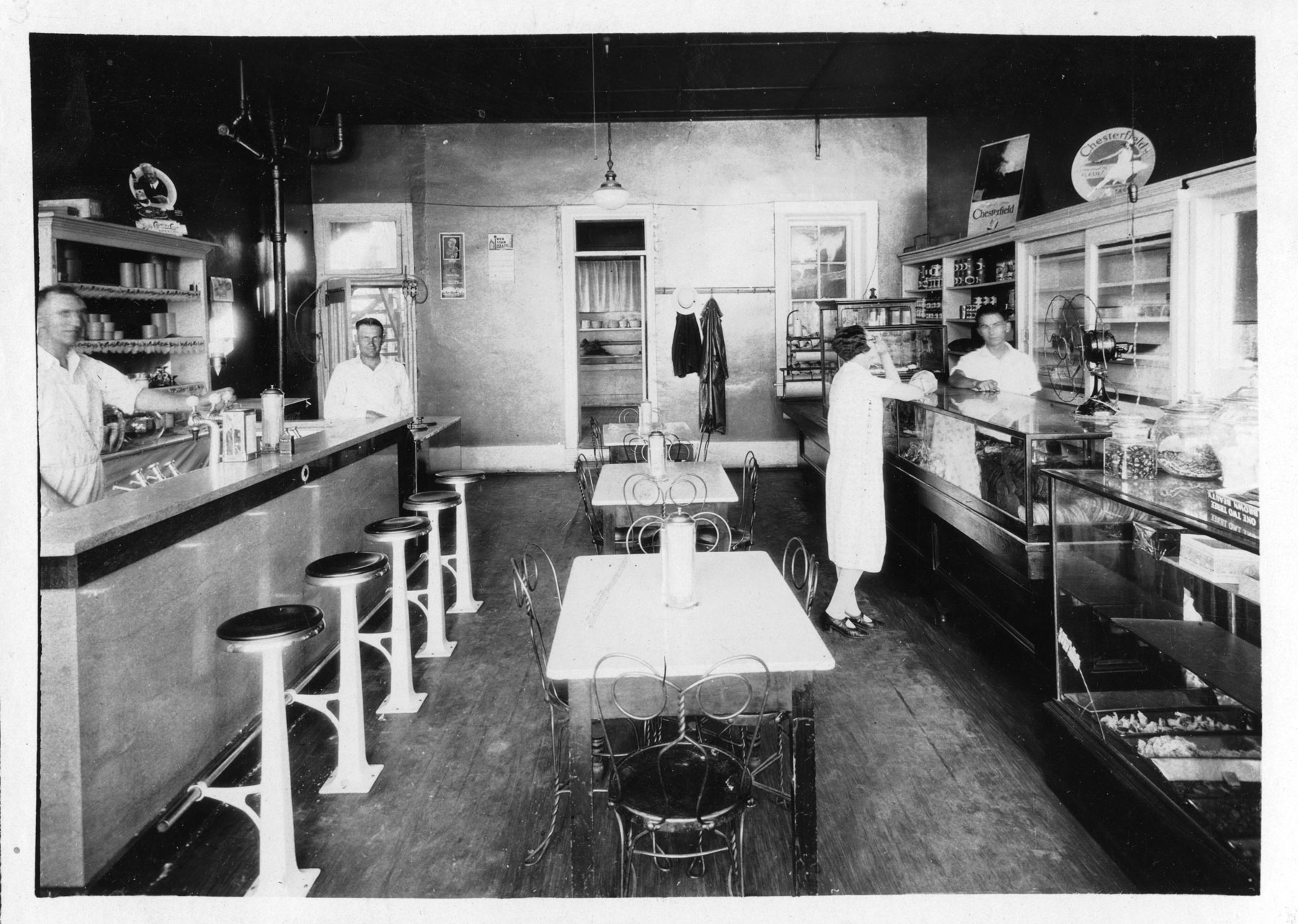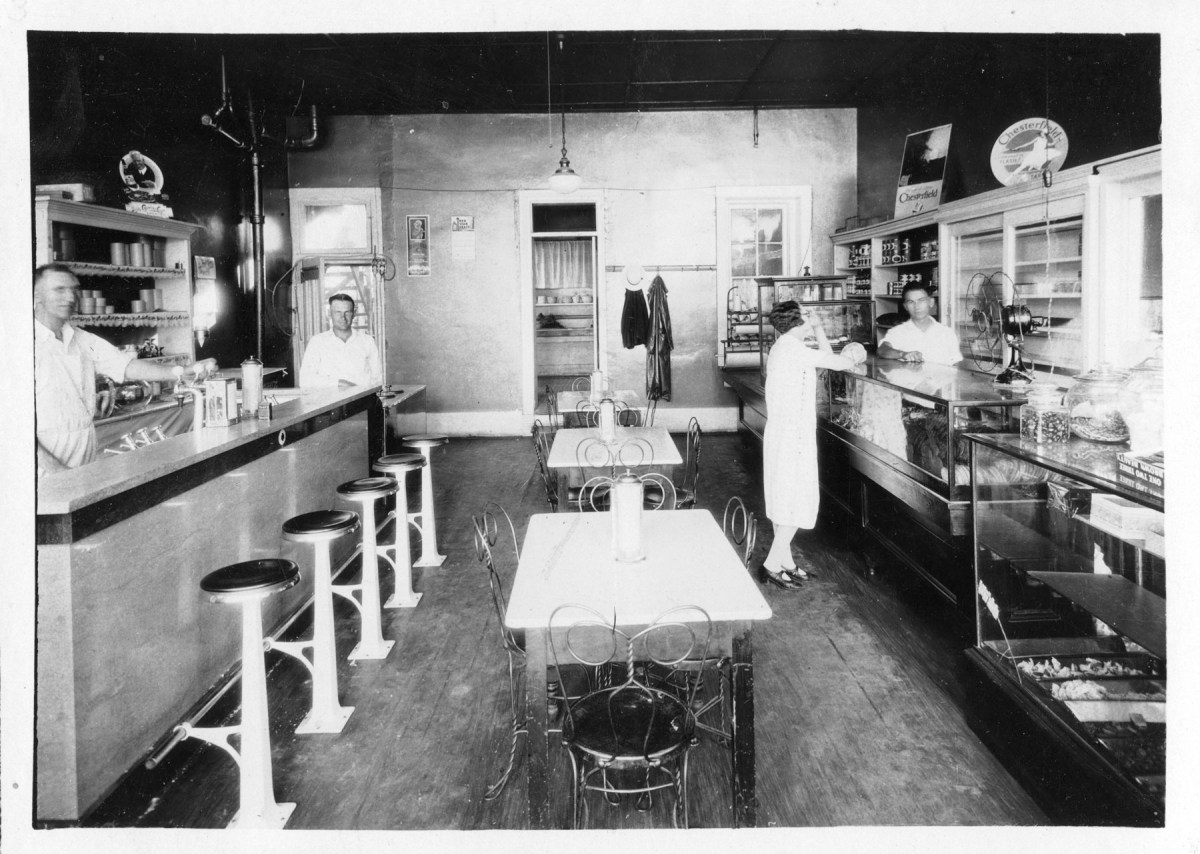 This interior view of an Alma, Kansas soda shop dates from the late 1930s.