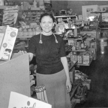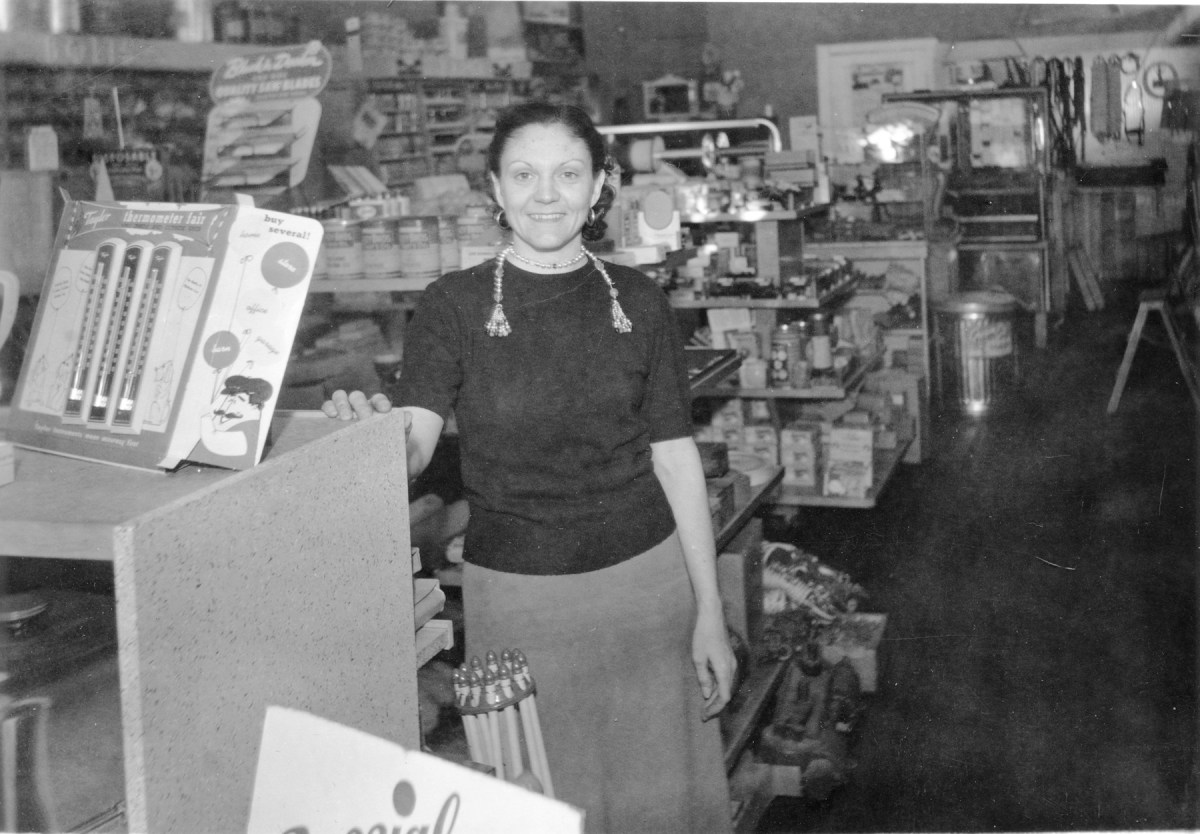 Gwen Hendricks stands by the merchandise counters in the hardware store that she and her husband, Marvin, purchased in 1952. This view was taken in the mid-1950s.