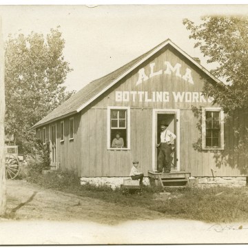 James Barger, in doorway, his wife, Dorthea, peering out the window, and their son, Norman, pose for this real photo postcard at their Alma Bottling Works plant in Alma, Kansas, circa 1908.