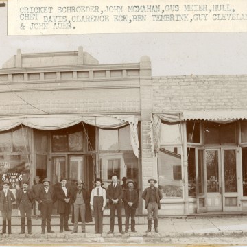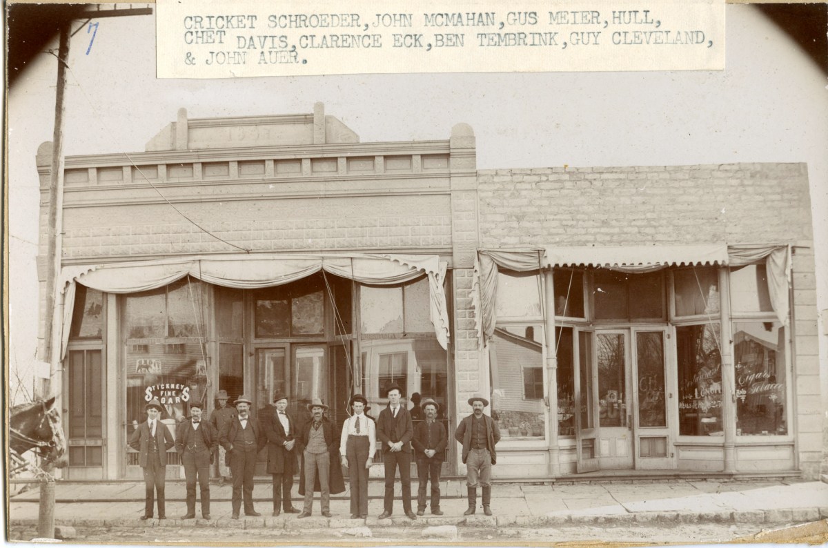 Guy Cleaveland, second from the right, operated the Alma Bottling Works from his feed store building located at 411 Missouri Street in Alma. Here, a group of Alma men stand in front of a cigar store located at 224 Missouri Street.