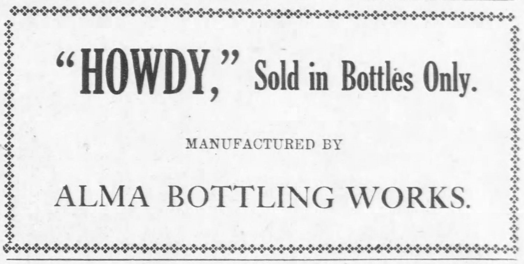The Alma Bottling Works was operated by the Alma Ice and Electric Co. during the 1920s. One soda pop the company offered was named, “Howdy.”
