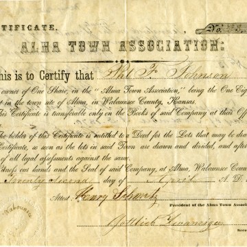 This stock certificate, dated 1866, gives one share of the Alma Town Association to the bearer, Phil Johnson. A single share was the equivalent of 1/80th interest in the new town.