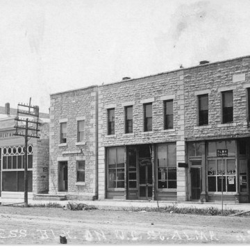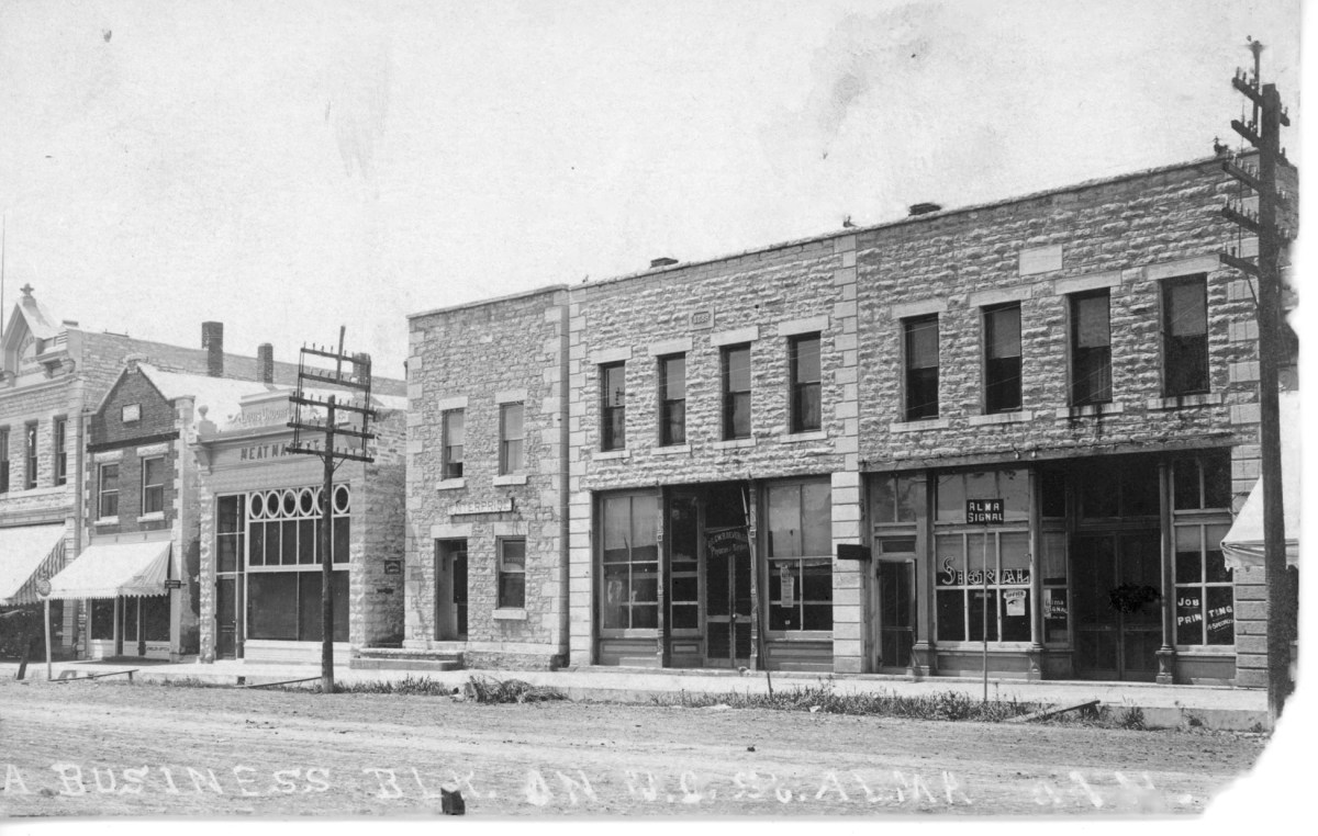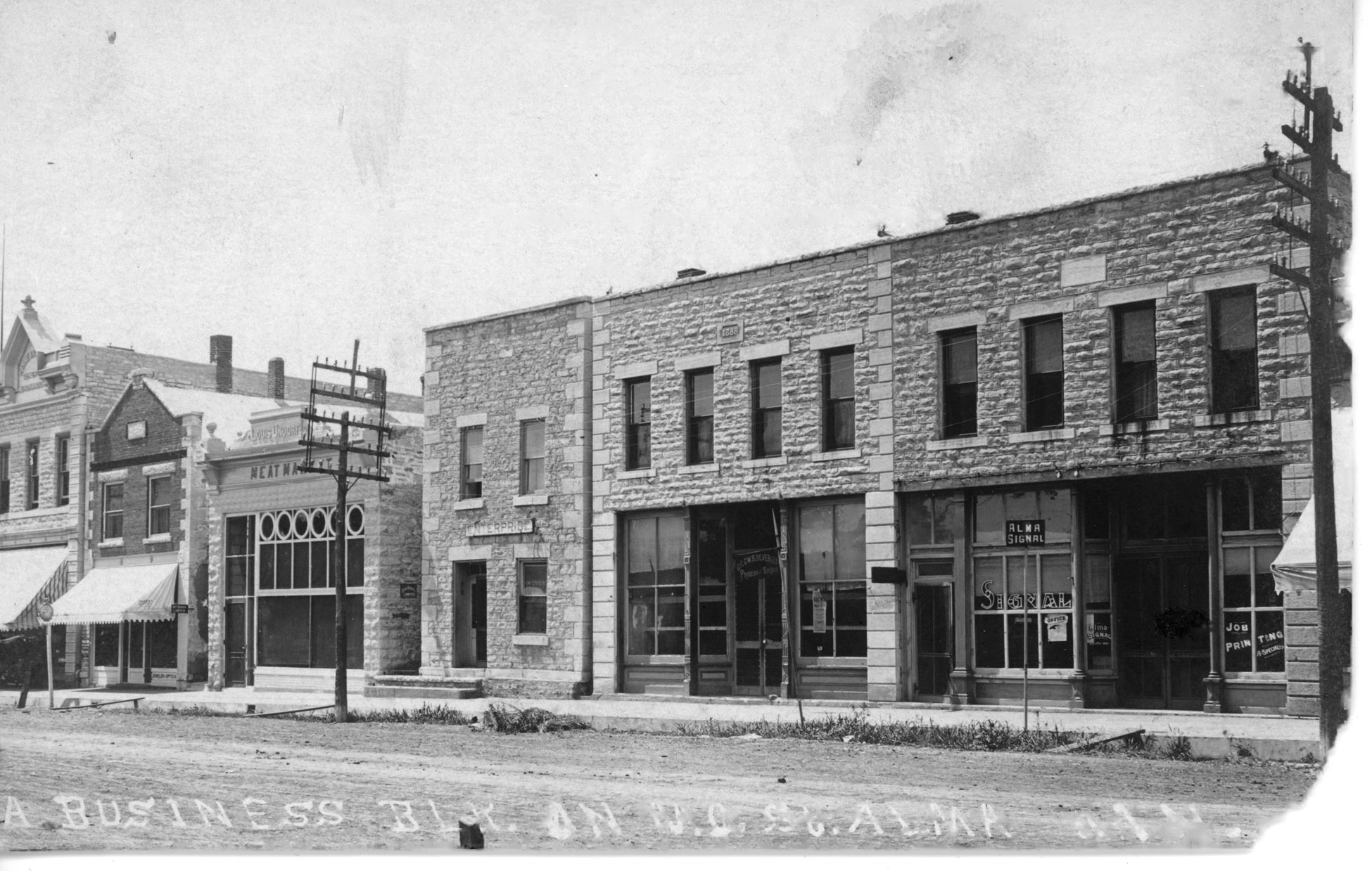 This real photo postcard view shows the business district of Alma, Kansas, located on the west side of the 300 block of Missouri Street. The buildings, identified from right to left, are, The Signal office, Dr. G.W.B. Beverley’s office, The Enterprise office, Undorf’s Meat Market, and Weaver’s Abstract. This photo view dates from about 1908.