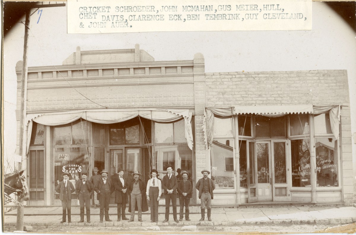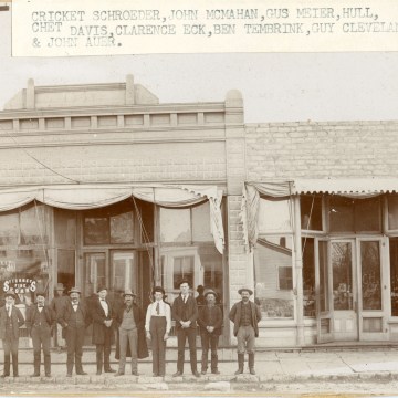 A group of Wabaunsee County men pose in front of “Johnnie Mac’s” saloon in Alma, Kansas in this view, circa 1900.