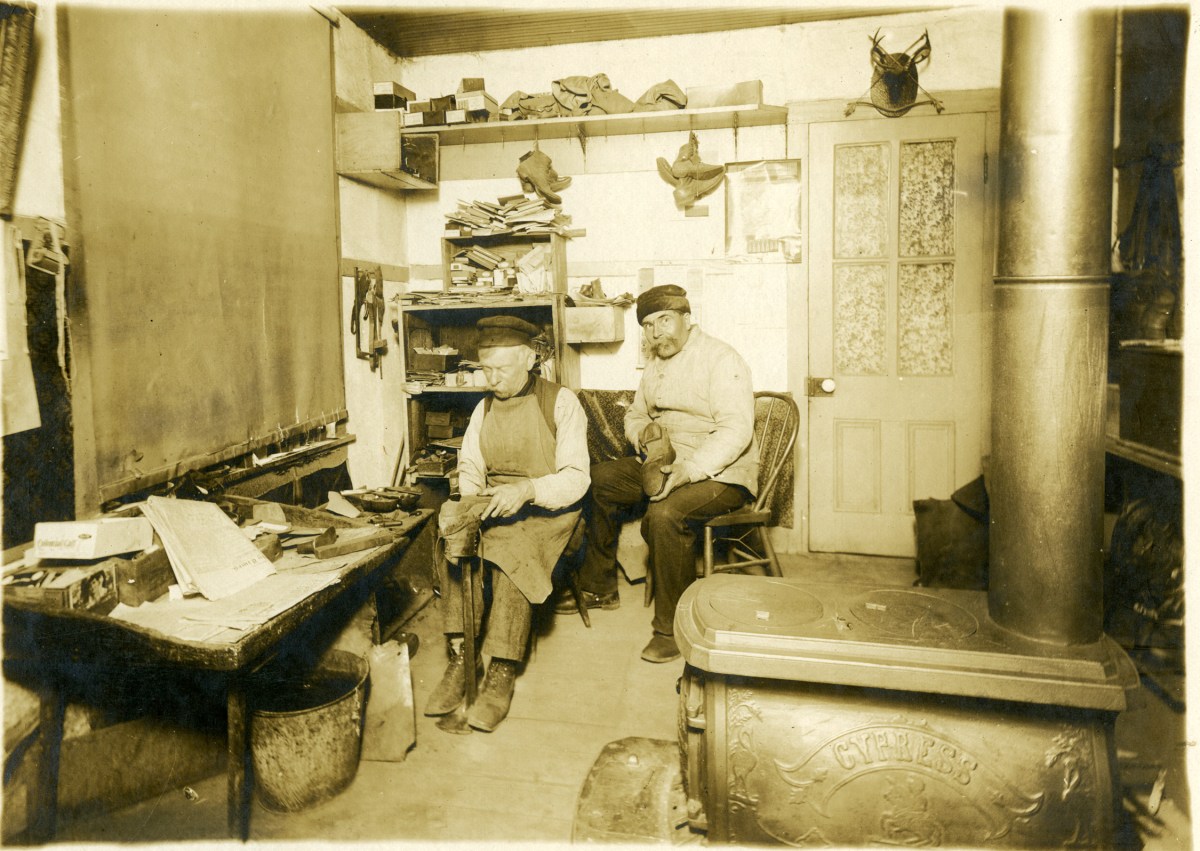 Ferdinand Herrmann, and his employee, identified as Mr. Kriegenhardt, work on shoes inside Herrmann’s Alma, Kansas shoe shop.