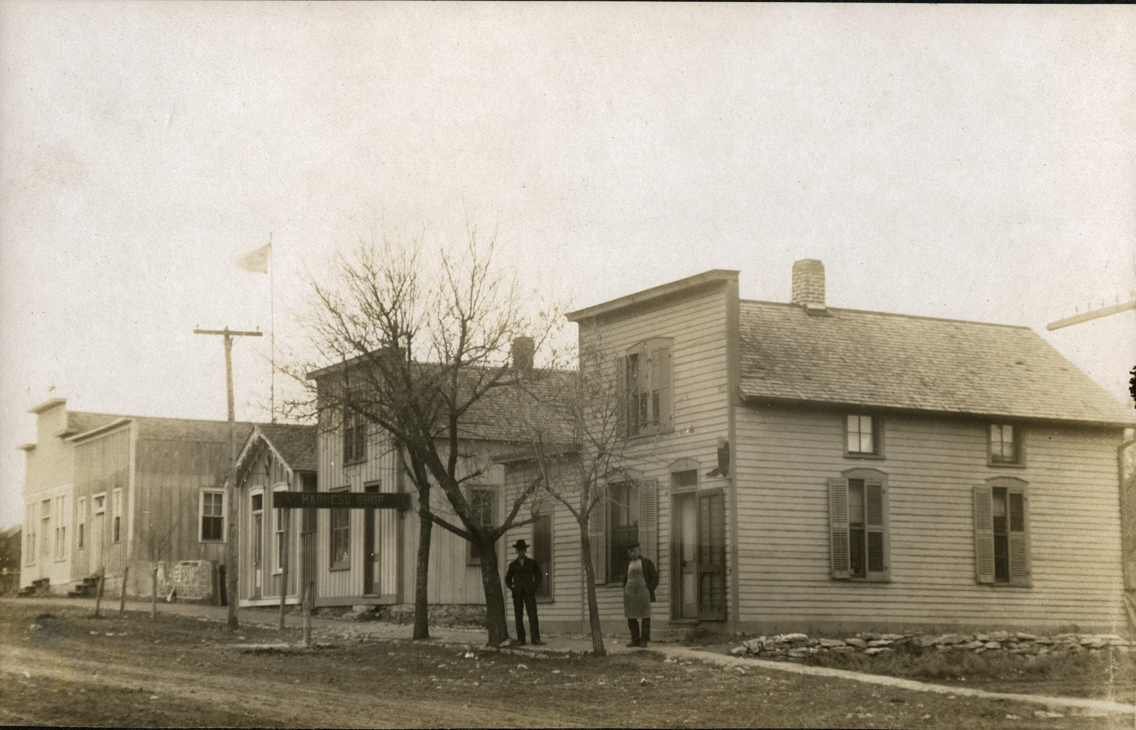 Ferdinand Herrmnn, right, and his son, Fred, stand in front of their shoe shop West Main Street in Alma, Kansas. Notice the boot hanging on the building by the door. To the west of the shoe shop one can see Herrmann’s Harness Shop, August Falk’s Alma Marble Works, a tailor shop, and Falk’s Opera House.