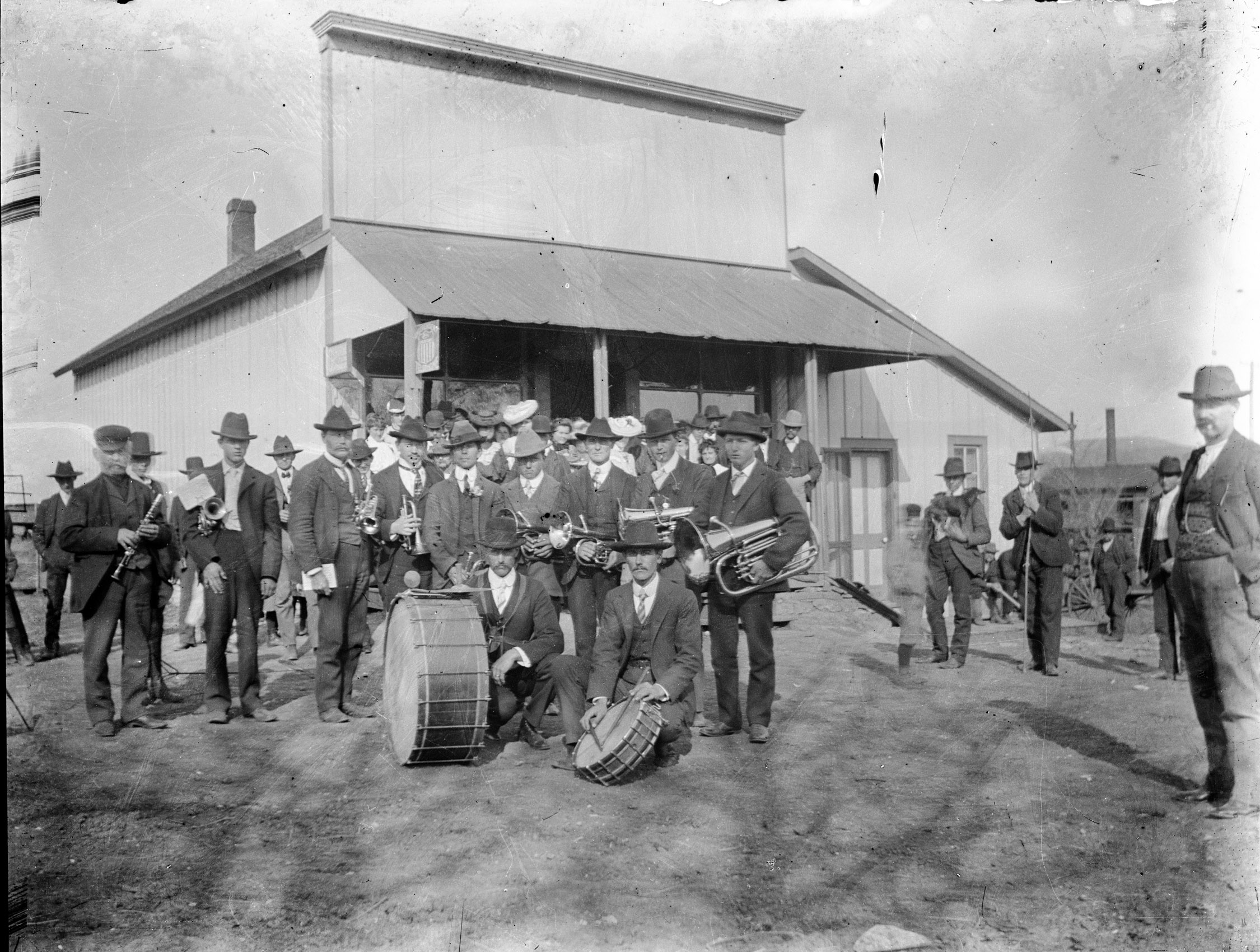The Volland Brass Band poses in front of the Kratzer Bros. store at Volland in this Otto Kratzer photo from 1905. Bandleader Ferdinand Herrmann is seen at the far left with his clarinet. Photo courtesy Karen Durso.
