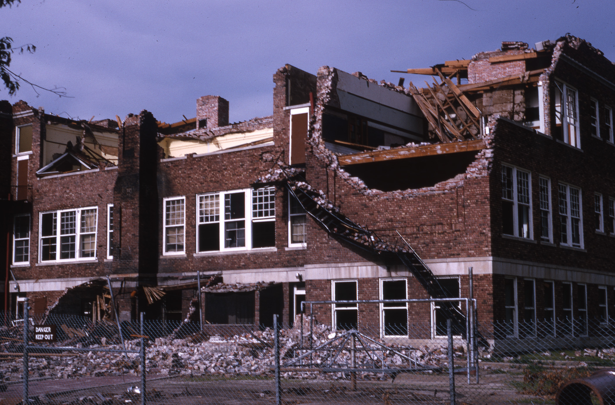 The 1966 tornado which ripped through Topeka destroyed the Central Park School beyond repair. Fortunately, school was not in session when the building was demolished by the tornado.