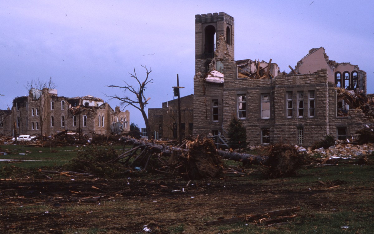 Charles Herman traveled to Topeka to photograph tornado damage from the famed 1966 storm which tore through the city. In this view one sees extensive damage to buildings on the campus of Washburn University.