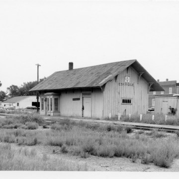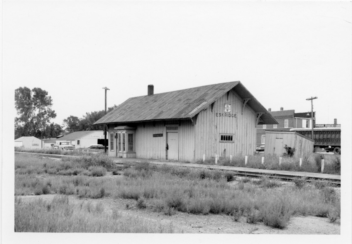 The Atchison, Topeka, & Santa Fe depot at Eskridge, Kansas had gone to seed when Dean Dunn took this photograph in the early 1970s.