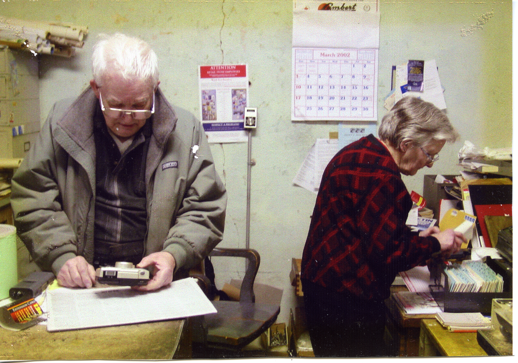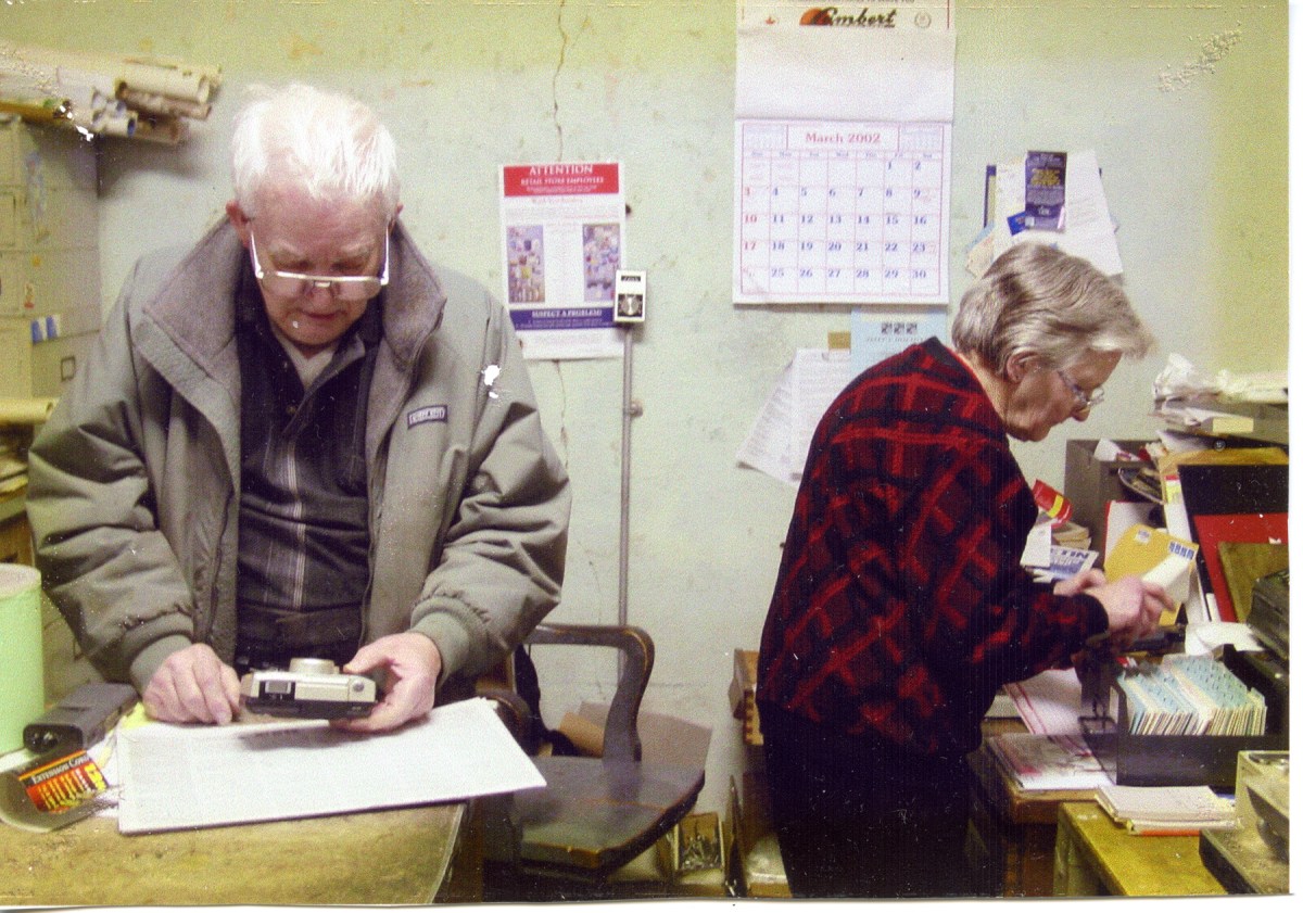 Dean Dunn holds a camera behind the counter of Dunn Home Supply while Inez Dunn, City Clerk, records utility bill payments in this view from March of 2002.