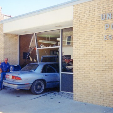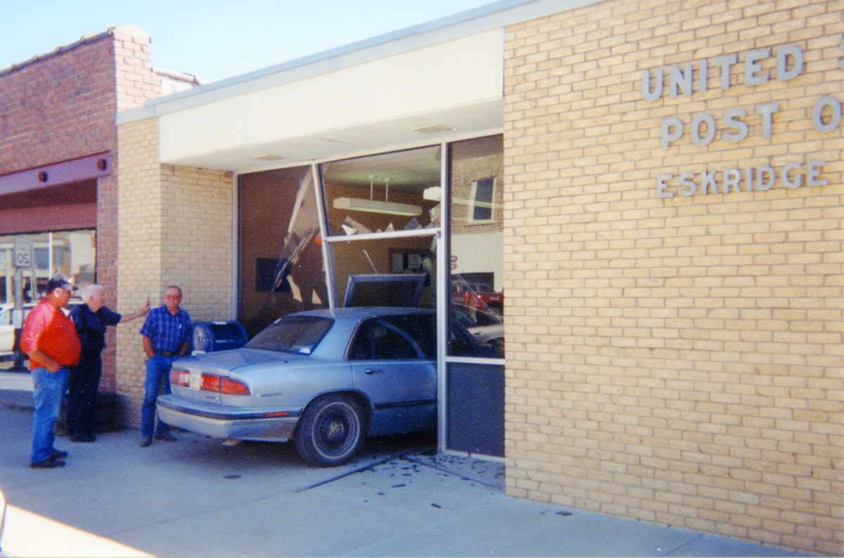 Bill Mercer, Dean Dunn, and Jack Price inspect the wreckage created when a customer of the Eskridge Post Office installed a drive-through window in the office in this view from about 2000.