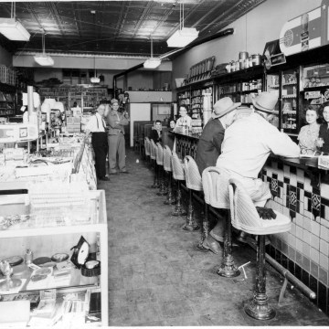 Preston Dunn stands at the left at the far end of the new soda fountain in his Rexall Drug Store located at 111 South Main Street in Eskridge, Kansas in this 1950s view.