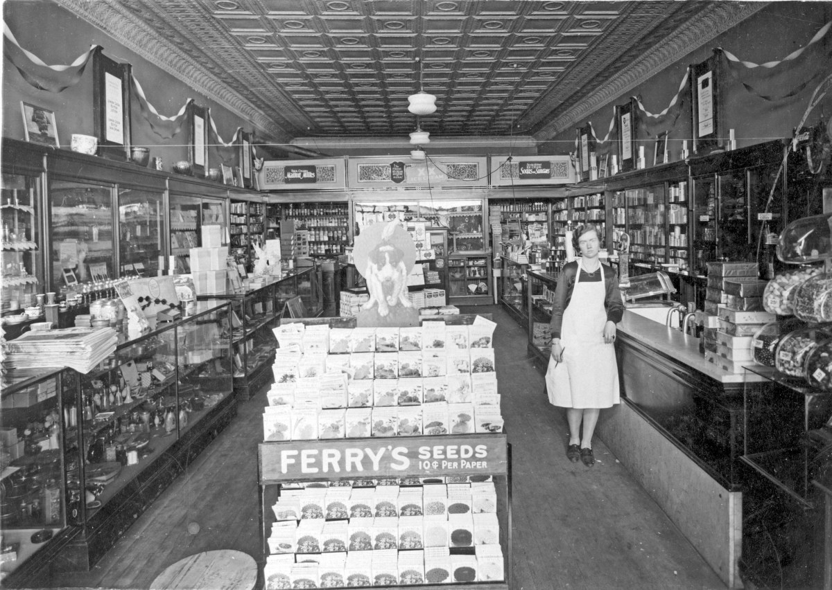 This is an early interior view of Preston Dunn’s Rexall Drug Store located at 111 Main Street in Eskridge, Kansas, circa 1935.