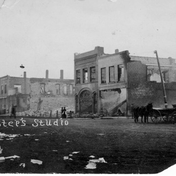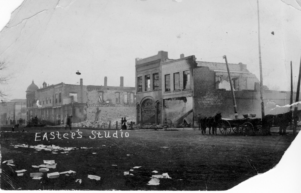 A massive fire swept down the west side of Main Street in Eskridge, Kansas on March 15, 1914, destroying nine buildings in the business district.
