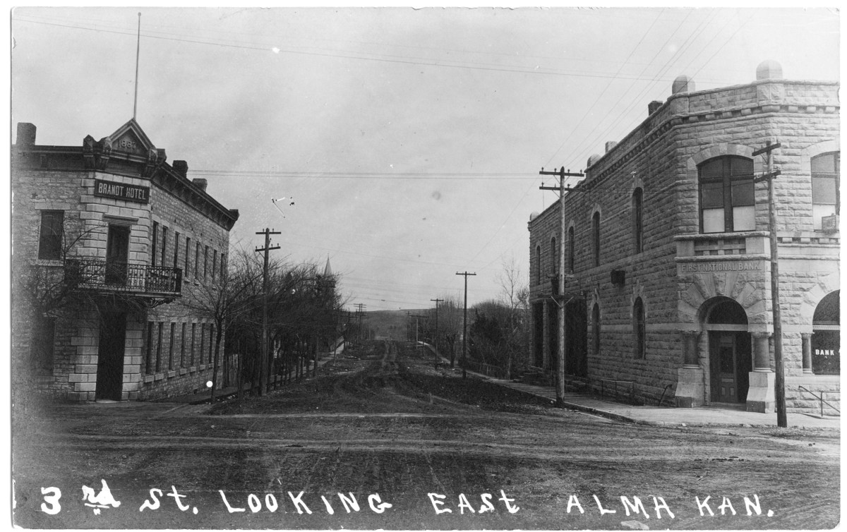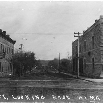 This real photo postcard from about 1908 looks to the east with the Alma Hotel located on the left and the Bank of Alma on the right.