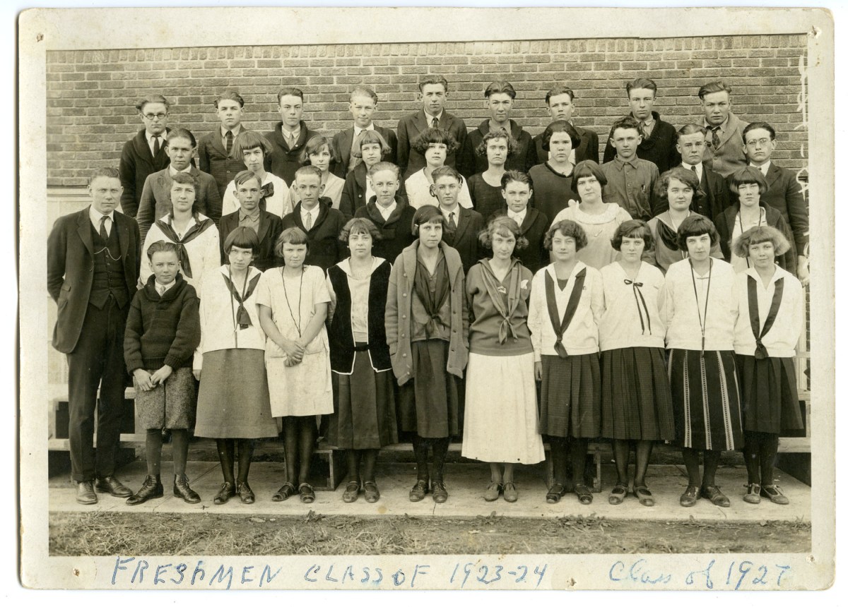 Pavilion School boys enjoy a game of marbles during recess. This photo, dated 1936 identifies the boys, left to right as Dan Glover, Dale Feyh, Dale Townsend and Bill Ekart.