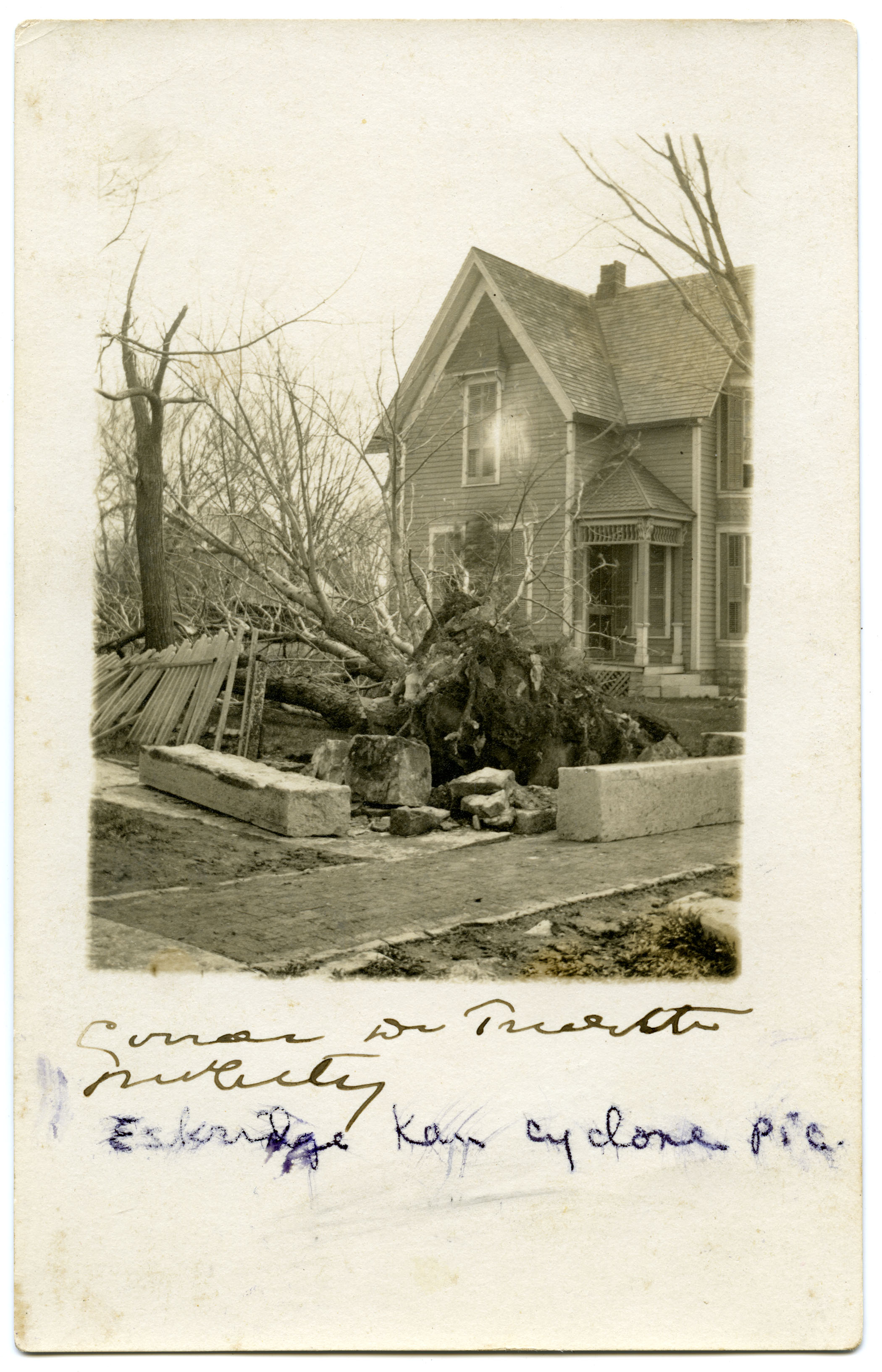 This real photo postcard from 1911 shows damage to Dr. Trivett’s home at Eskridge, Kansas.