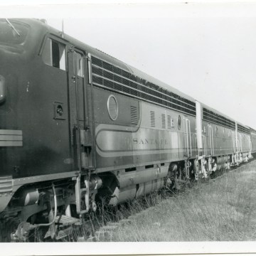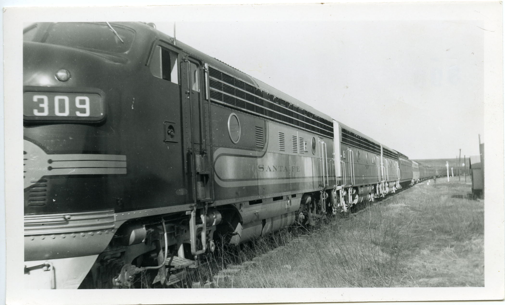 An ATSF Streamliner stops at the Eskridge depot to board schoolchildren who are taking a trip to Kansas City in this 1950s view.