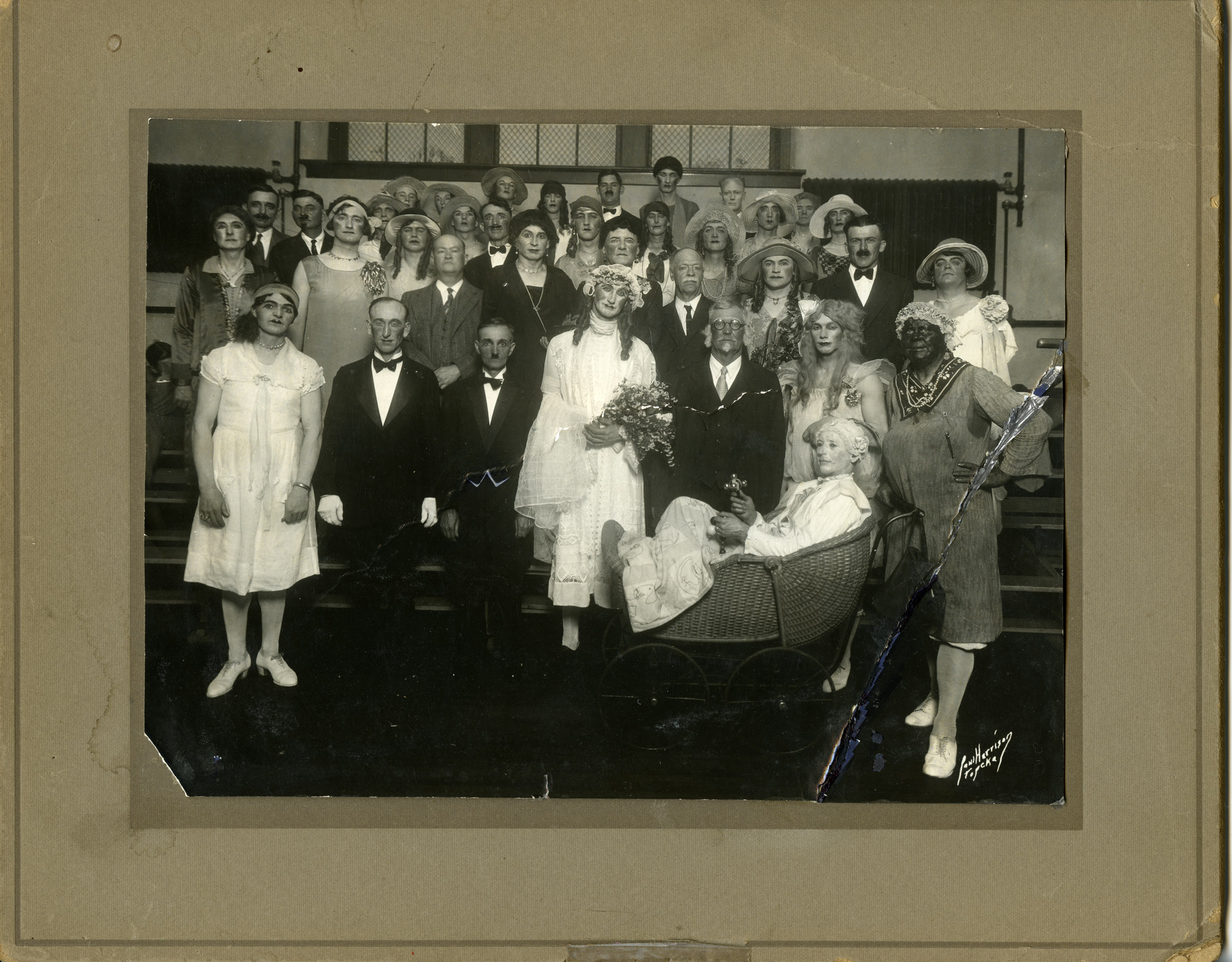 This early 20th century view from Eskridge, Kansas is titled, “Womanless Wedding”. Many of the men pictured are identified on the reverse.