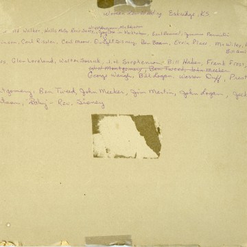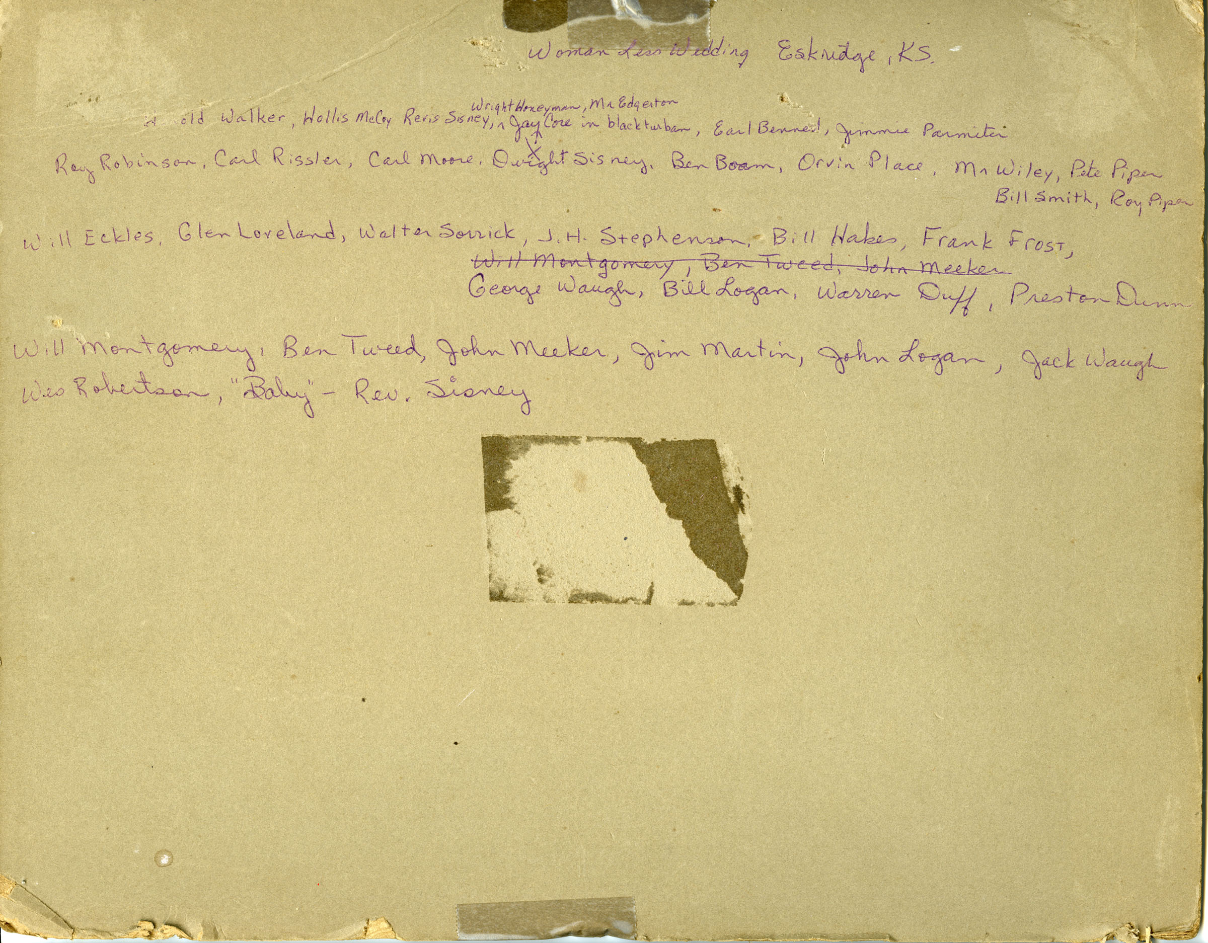 Reverse side of photo, “Womanless Wedding”, Eskridge, Kansas