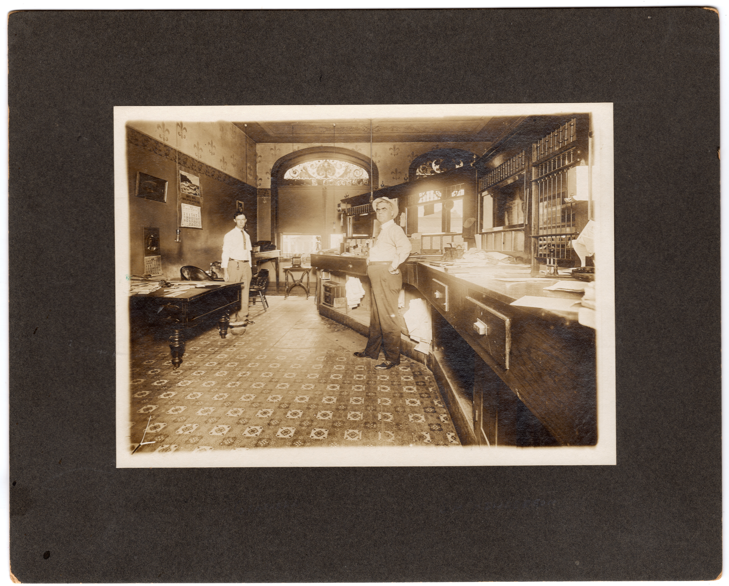 Oliver W. Hess, left and J. R. Henderson stand behind the teller’s cages in the Alma National Bank located at 311 Missouri Street in Alma, Kansas in this view from 1911. Photo courtesy Alan Hess.
