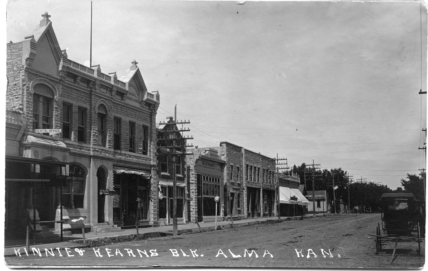 The Kinnie & Kerans building, located at 311-313 Missouri Street in Alma, was the home of the Alma National Bank (in the south side of the building) and Cassiday’s Grocery (in the north side of the building) when this real photo postcard view was taken in about 1908.