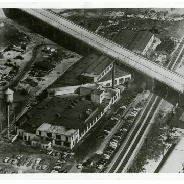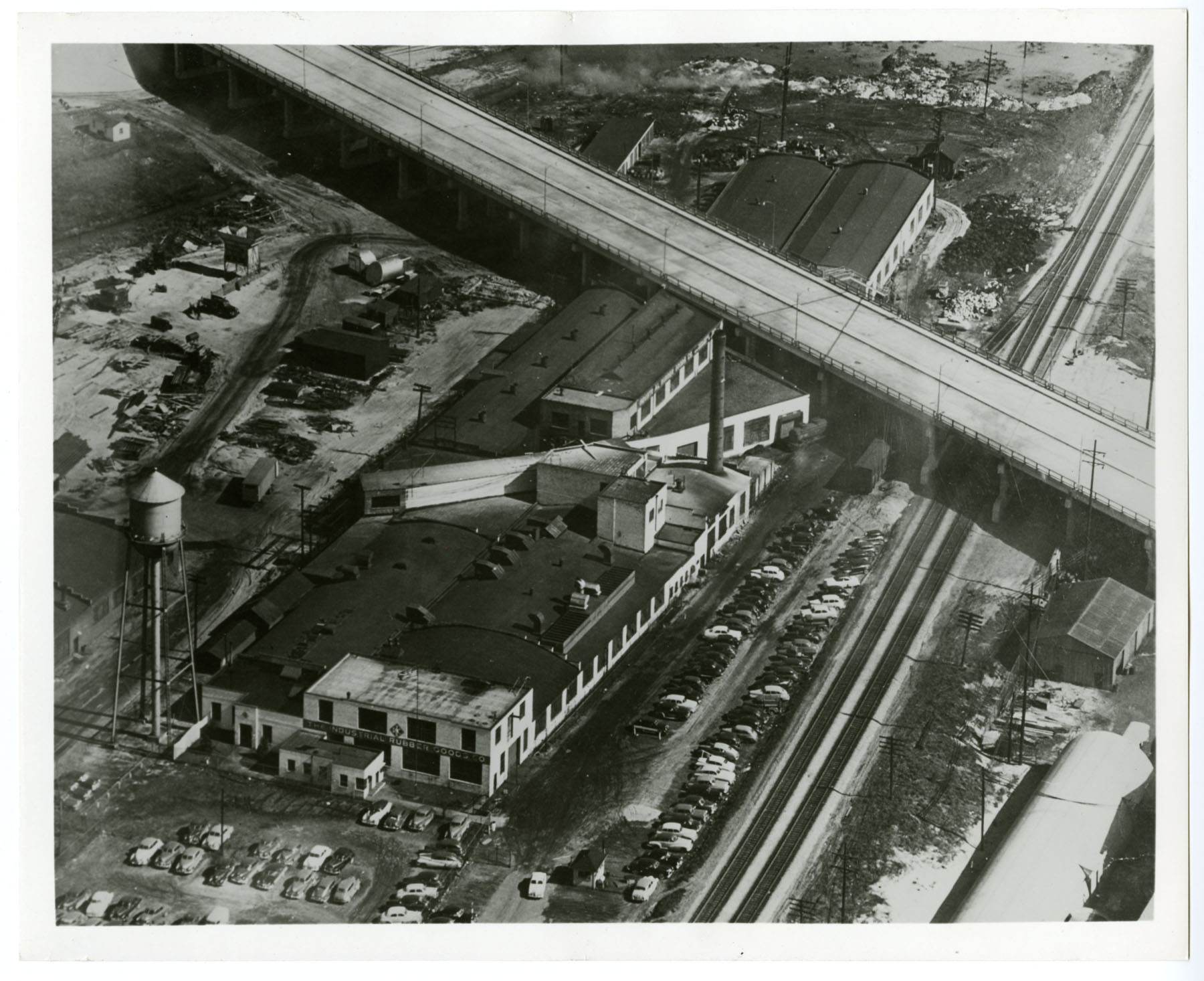 This aerial view of The Industrial Rubber Goods Co.’s Edgewater plant dates from about 1950, showing almost 100 employees’ cars parked at the factory. Photo Courtesy of the Minnetrista Heritage Collection, Muncie, Indiana.